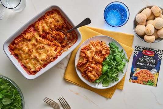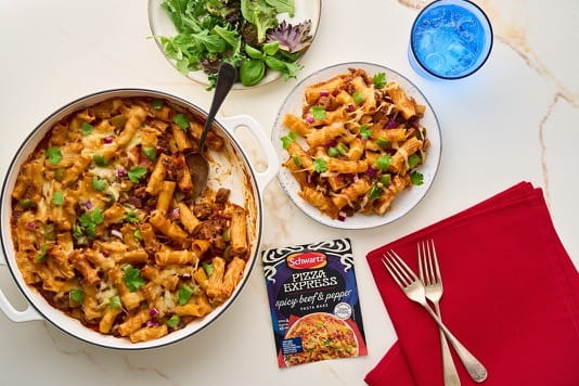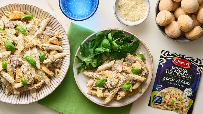 Inspired by the pizza and pasta dishes you know and love from PizzaExpress, our range of delicious recipe mixes includes Garlic & Basil Creamy Pasta, Tomato & Herb Pasta Bake, and Spicy Beef & Pepper Pasta Bake. Easy to prepare with just a few simple ingredients from your pantry or fridge, each meal comes together in 40 minutes or less!