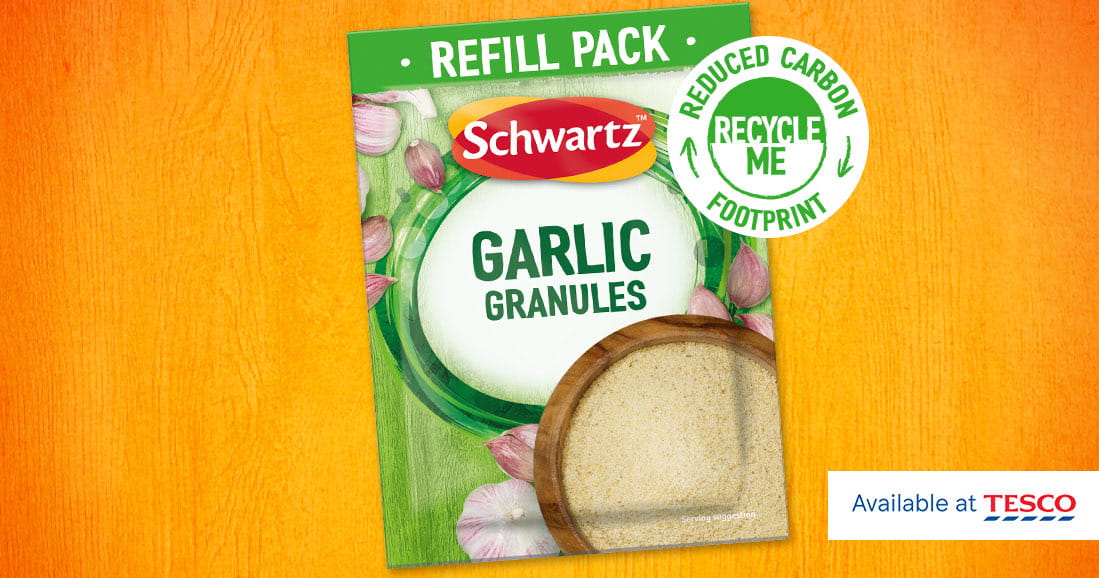 Use a Schwartz Garic Granules refill sachet instead of purchasing another 50g glass jar to result in a 37%* carbon footprint reduction. Refilling your Schwartz glass jar is a great way to help the environment with sachets producing less emissions than glass jars, so you can continue to create flavourful meals while knowing you’re making a positive difference.