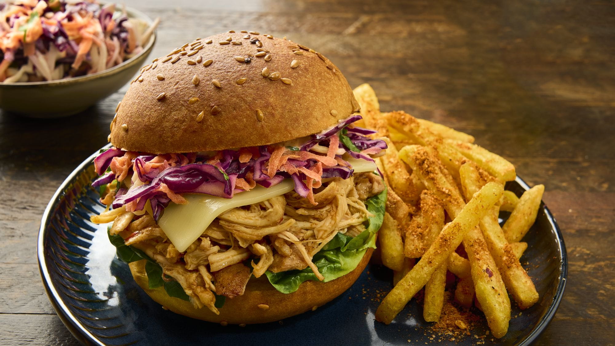Enjoy the unmistakable flavour and heat of OLD BAY® Hot Sauce in these easy homemade pulled chicken burgers. Topped with Cheddar cheese and a crunchy, colorful slaw, it’s a tasty way to treat everyone at your table to a little OLD BAY.