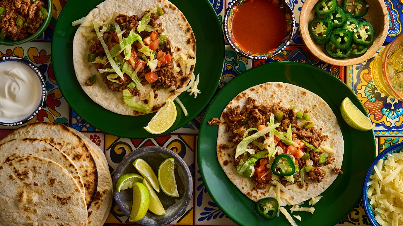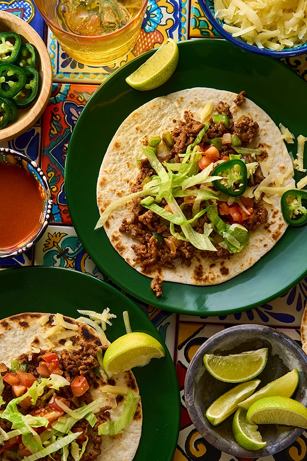 Spicy minced beef tacos served with lettuce, green chilli, tomatoes and spices in small wooden tray
