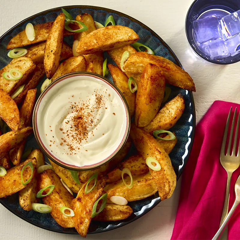 Crispy Potato Wedges with Spring Onions and Sour Cream